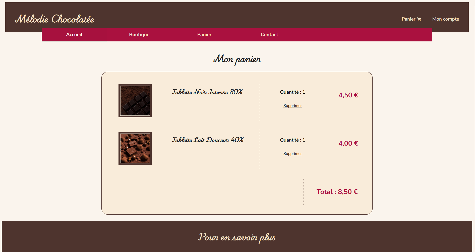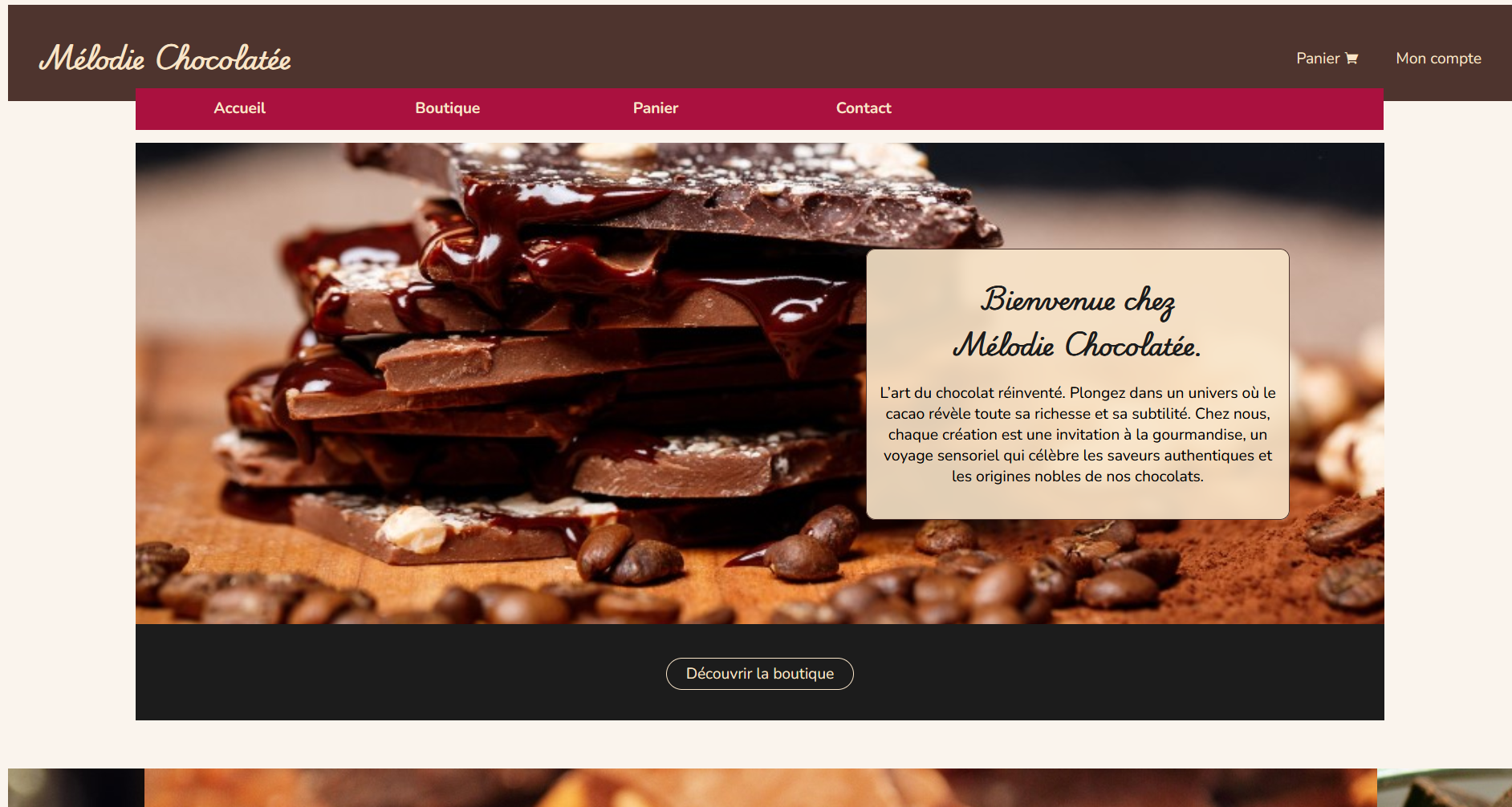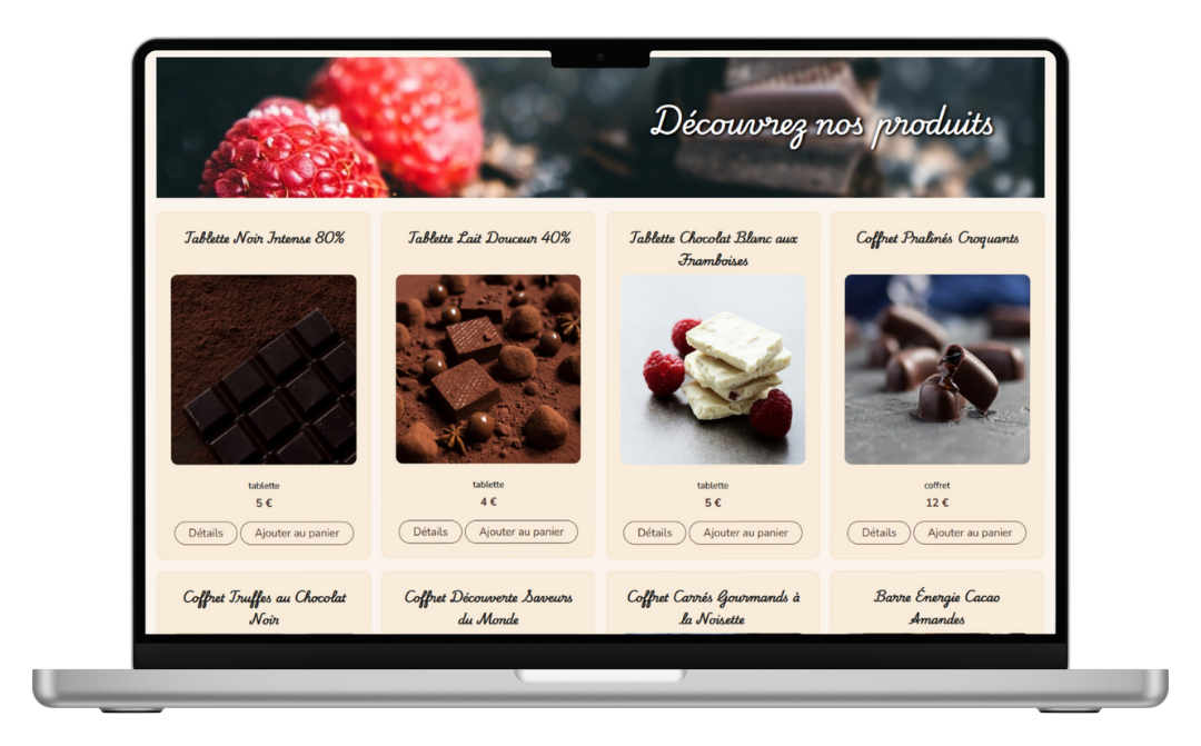 Un site d'e-commerce fictif ayant pour thème la vente de chocolats. Je l'ai codé en HTML, CSS et PHP. Celui-ci est rendu dynamique grâce à une base de données qui permet de faire évoluer les produits proposés.