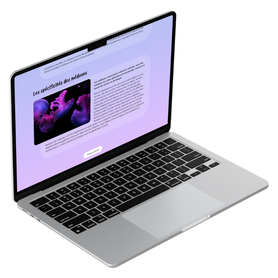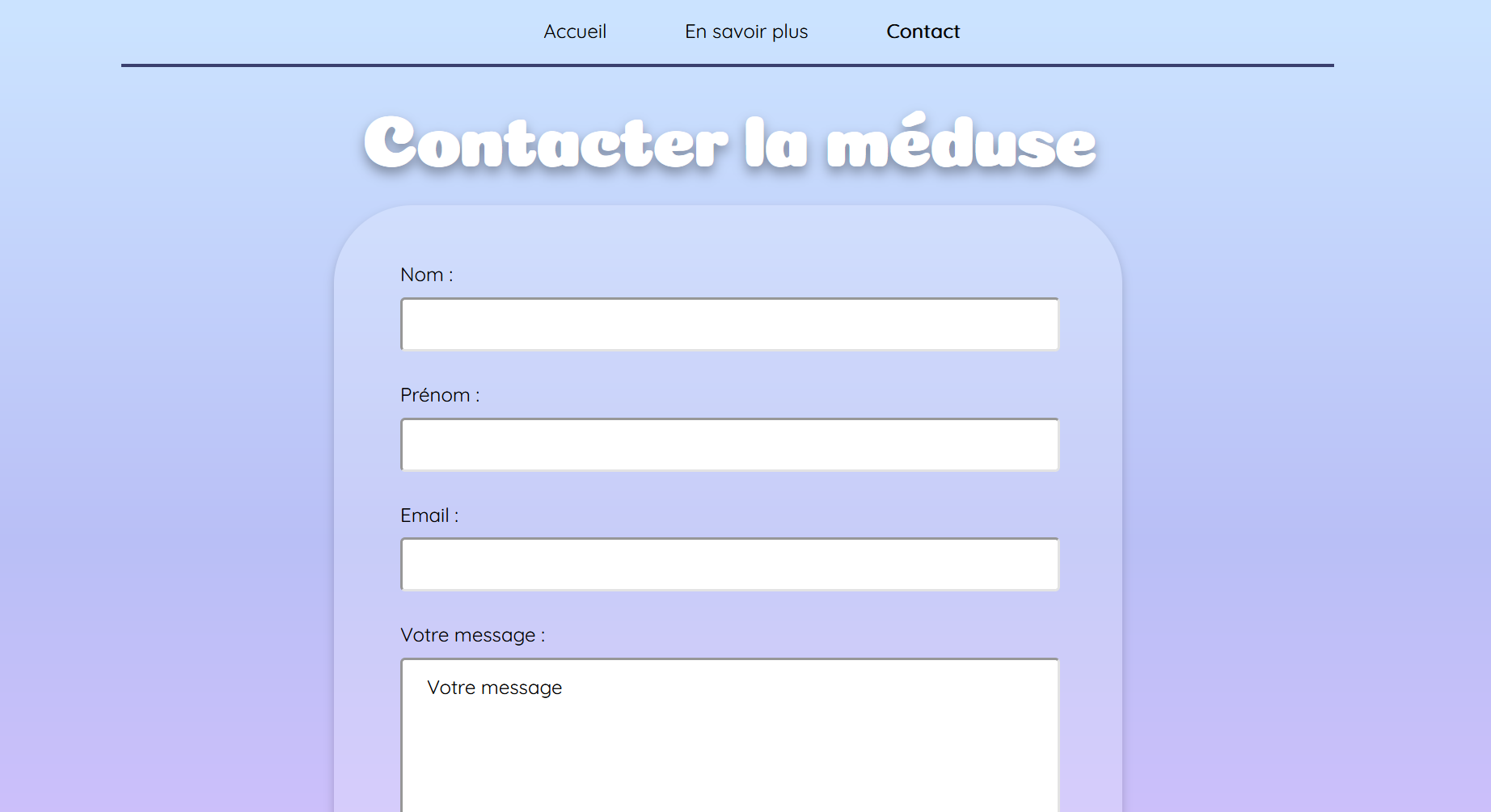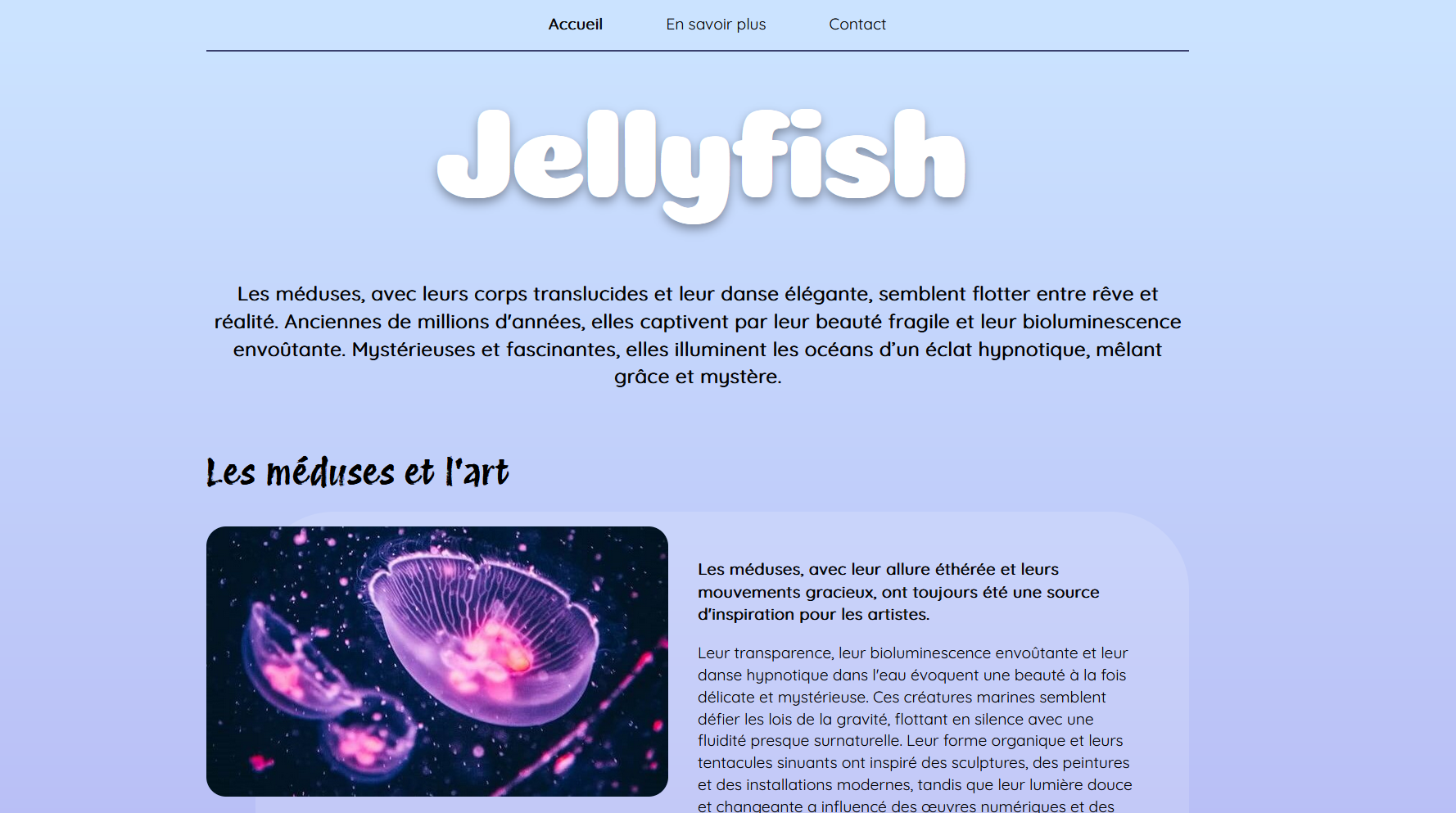 Mon tout premier site web, pour lequel je me suis inspirée de la méduse. Je me suis inspirée de cet animal, aussi bien pour le thème coloré que pour les formes. J'ai également essayé de reproduire son mouvement en utilisant des animations et des effets au passage de la souris.
